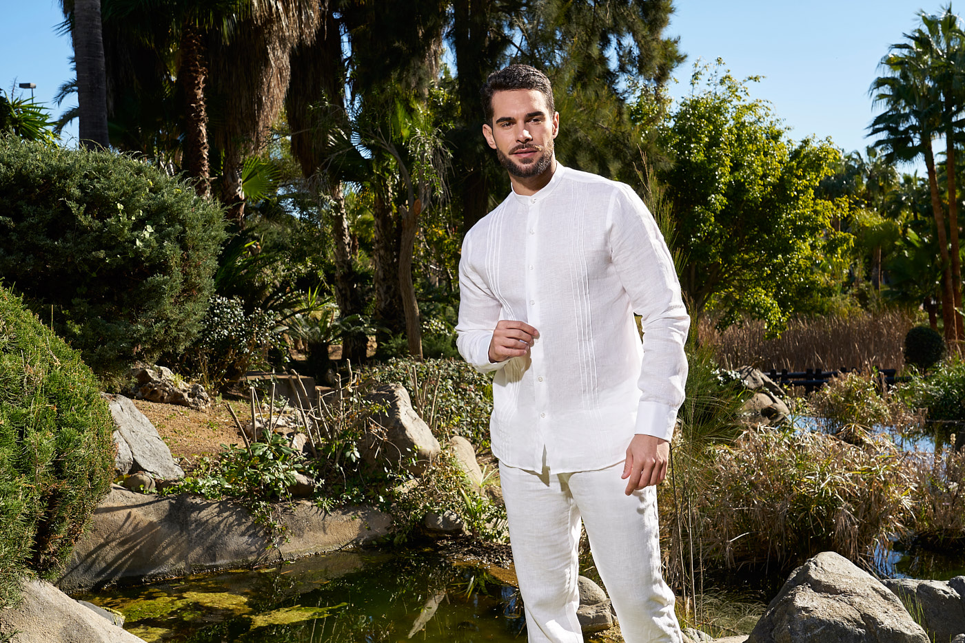 Camisa ibicenca de lino cuello mao de lino modelo Sotogrande para caballero en manga larga realizada en Lino 100% y fabricada en España. Slim Fit. Posee detalles verticales. Puños compatible con uso de gemelos. Somos especialistas en ropa de lino para hombre. Elige tu talla habitual. Envios en 24 horas