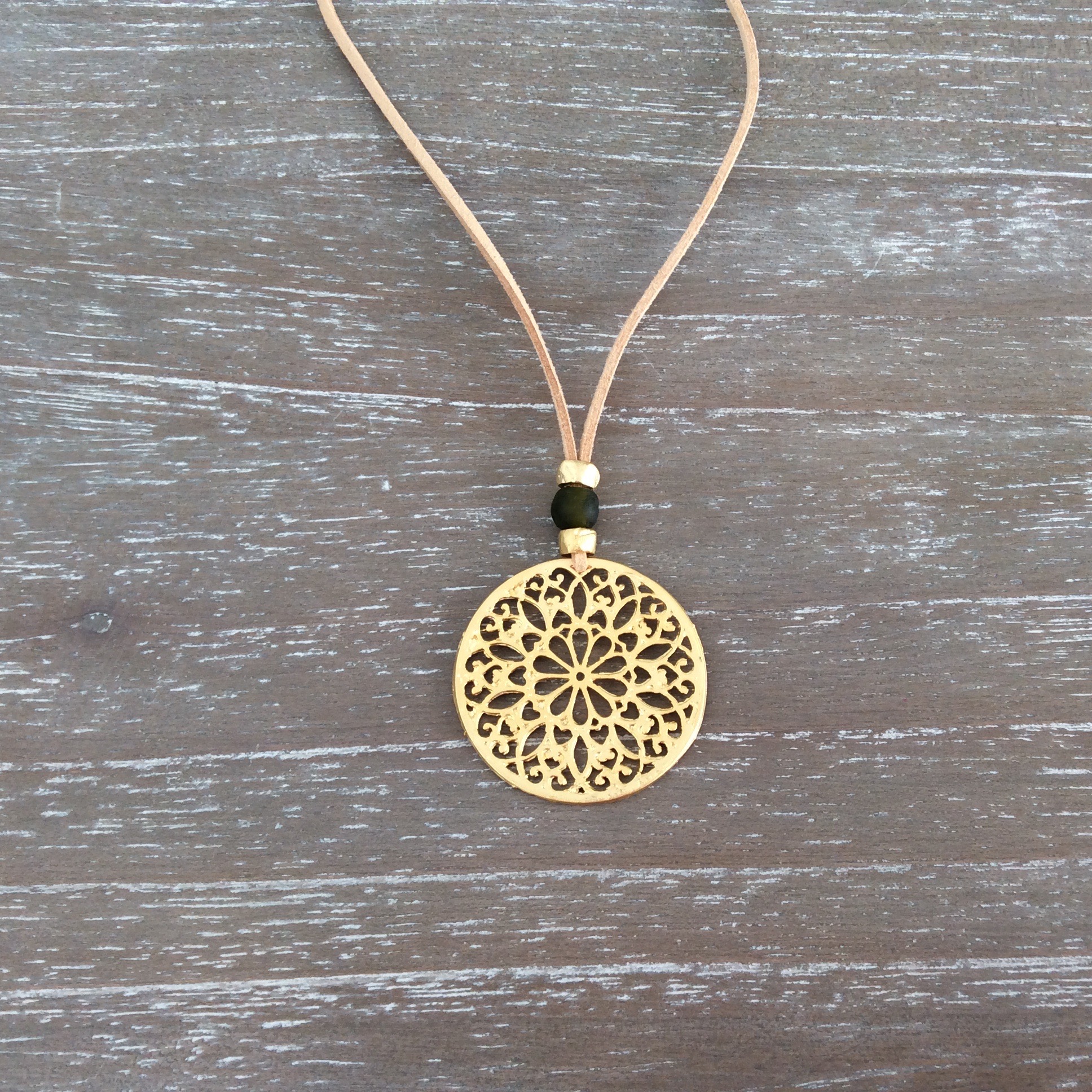Colgante Jaen realizado en España. Collar de antelina y pieza de fundición dorada. Bisuteria de máxima calidad. Envios en 24 horas