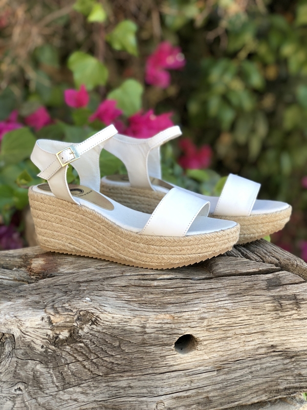 Sandalia ibicenca Itaca realizada a Mano en España. Cuña de yute y exterior piel vacuno blanca. Posee plantilla de 2 mm para garatizar su comodidad.Altura de la cuña 7 cm. Envios en 24 horas. Elige tu talla habitual