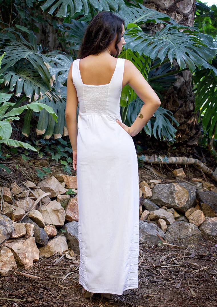 Vestido ibicenco Panamá bordado a mano. Vestido largo con bordados artesanales y espalda con goma ajustable para un acoplamiento perfecto. Forro de algodon para evitar trasparencias. Pruébatelo en casa cómodamente! Primer cambio de talla o devolución GRATIS!
